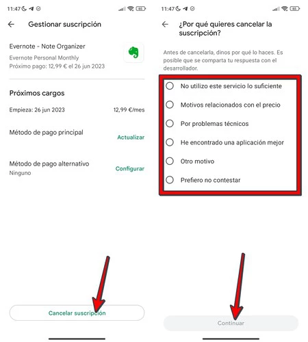 Similar a la App Store de Apple, si te suscribiste mediante Google Play Store, debes gestionar la cancelación a través de Google Play. Abre la aplicación Google Play Store en tu dispositivo Android, accede a tu perfil, busca la sección "Pagos y suscripciones" y luego "Suscripciones". Localiza tu suscripción a Evernote y cancela siguiendo las instrucciones. La cancelación se aplicará al final del ciclo de facturación actual.